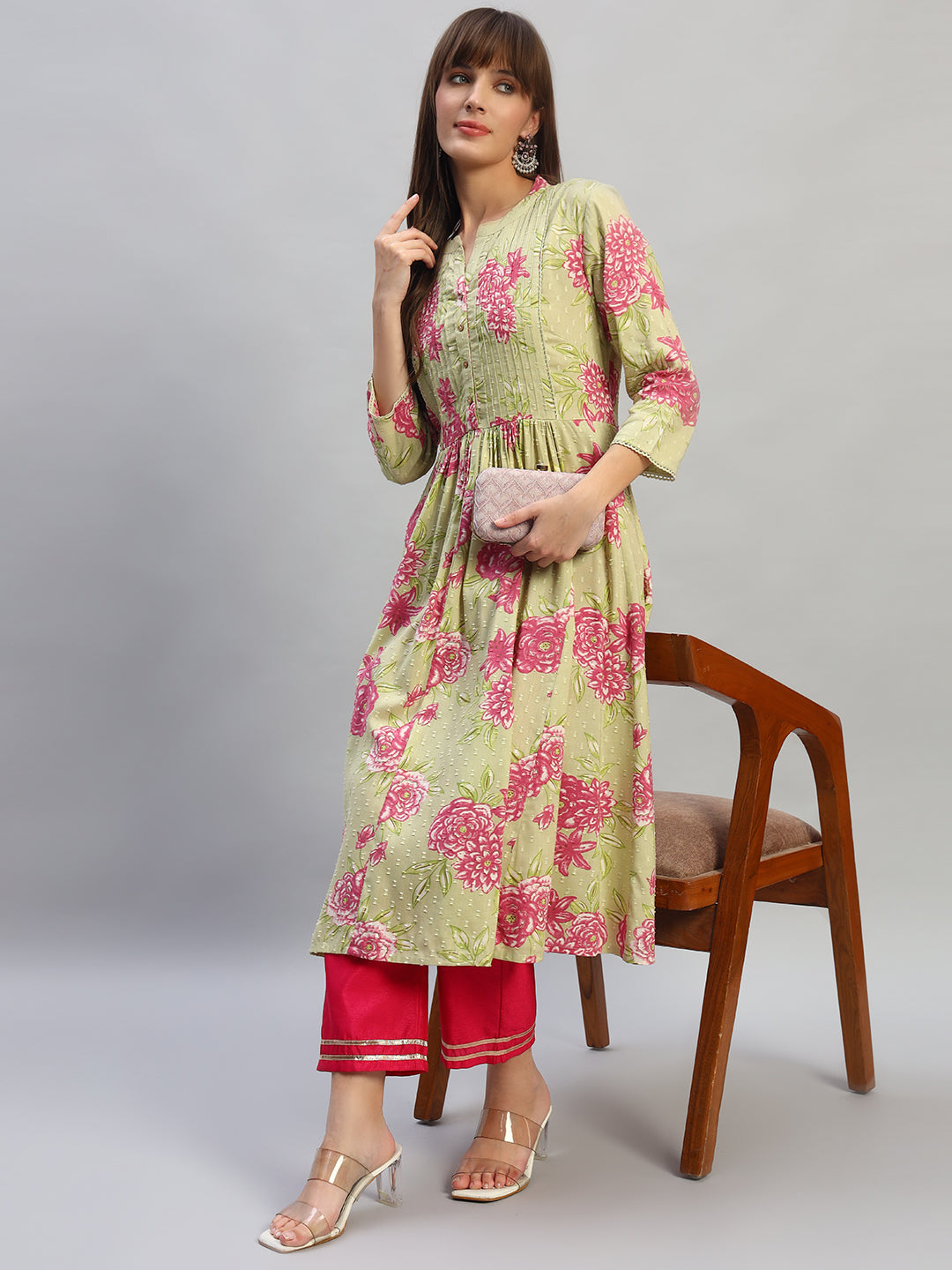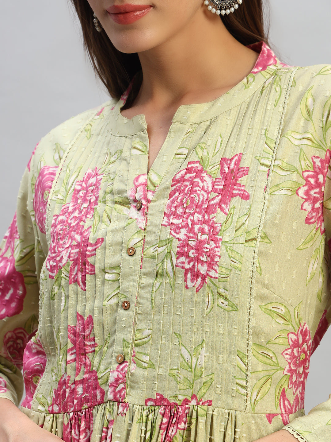 Women's Printed Green V-Neck 3/4th Sleeves Casual Kurti