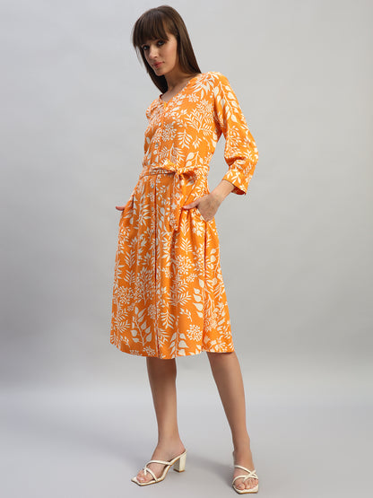 Women's Printed Orange V-Neck 3/4th Sleeves Casual Dress