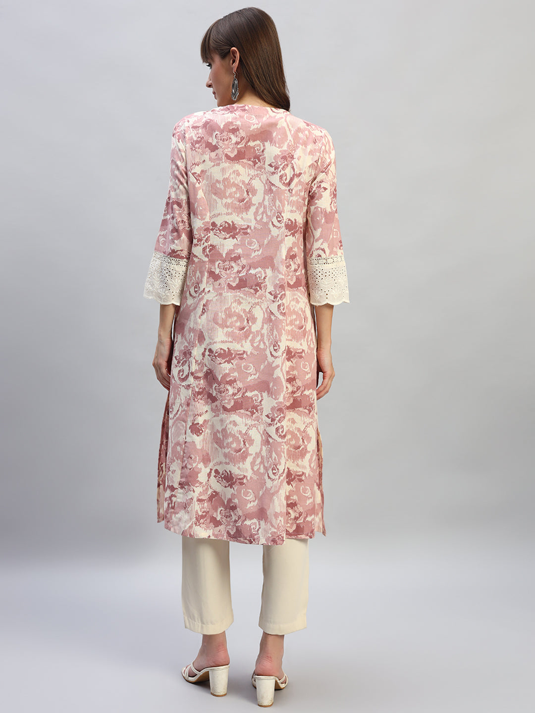 Women's Printed Pink Round Neck 3/4th Sleeves Casual Kurti