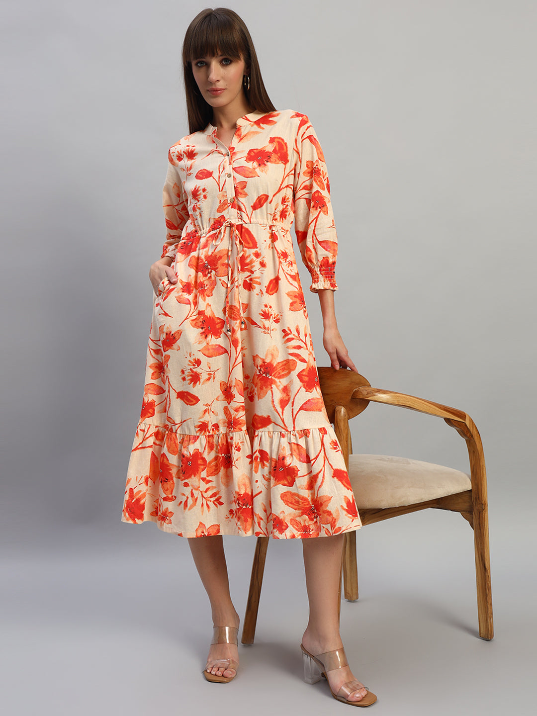 Women's Printed Pink V-Neck 3/4th Sleeves Casual Dress