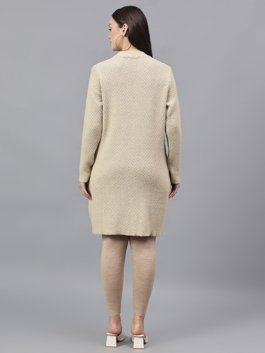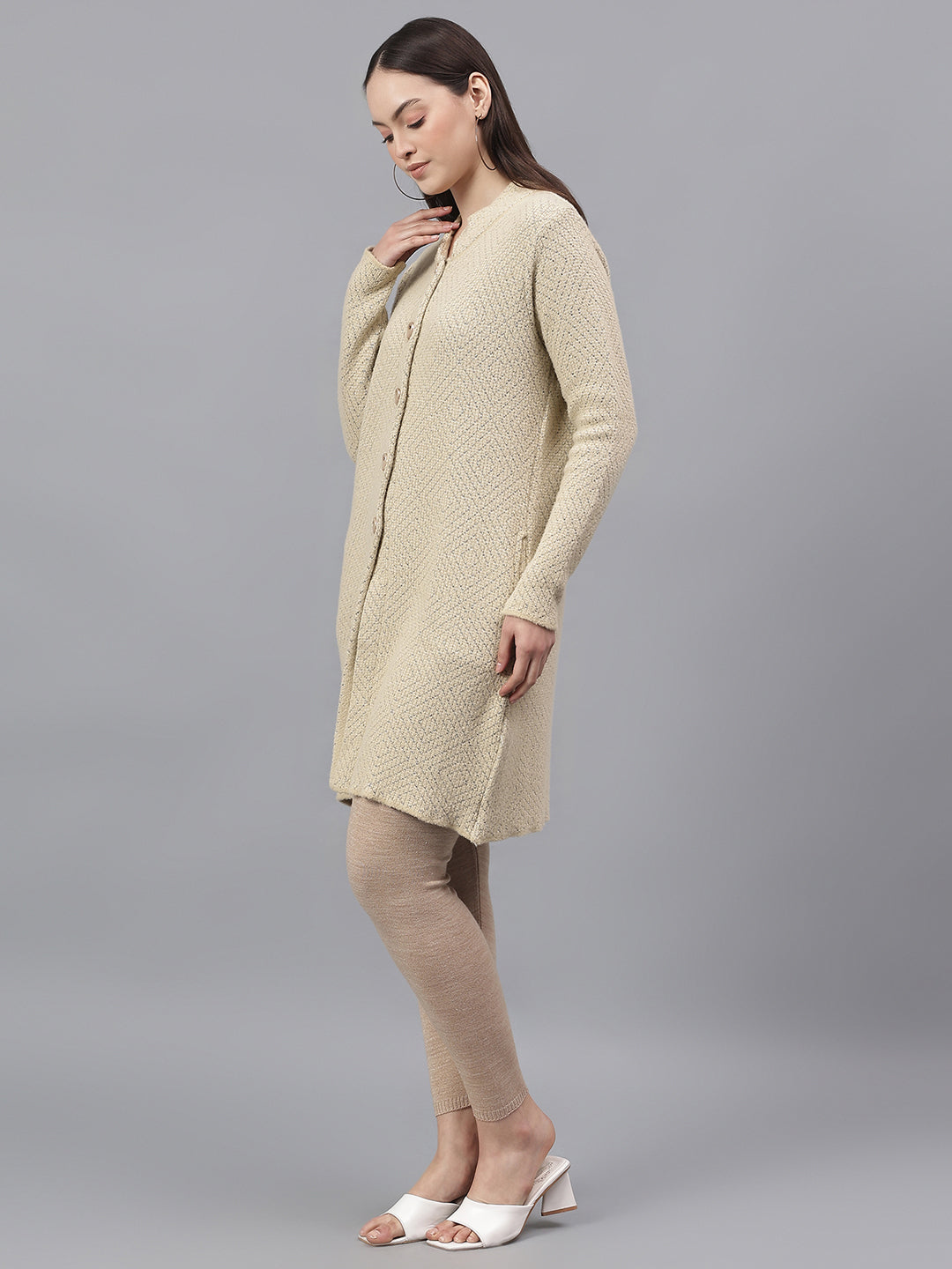 Women's Self Design Beige Mock Neck Full Sleeves Casual Sweater