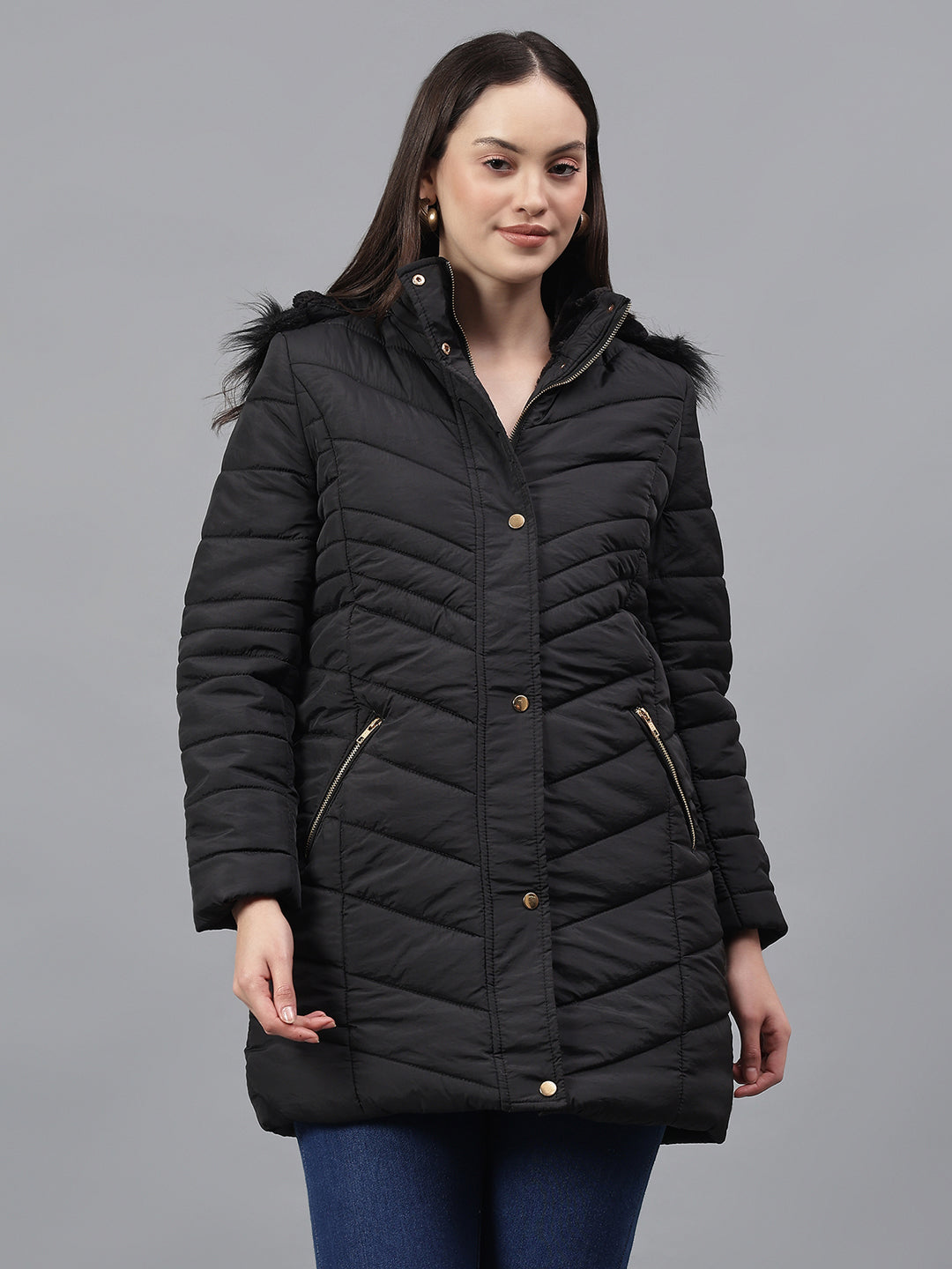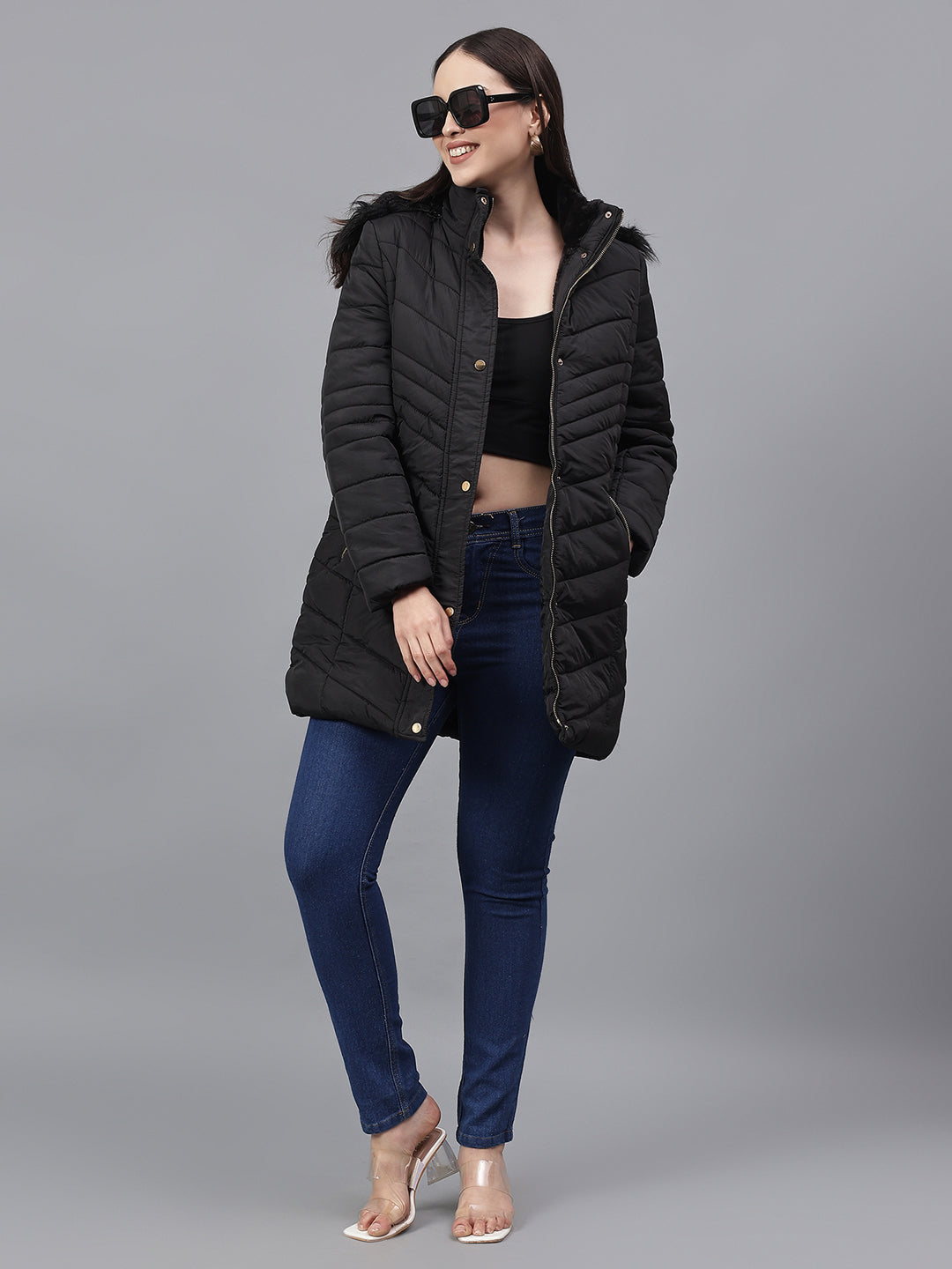 Women's Solid Black Hooded Neck Full Sleeves Casual Jacket