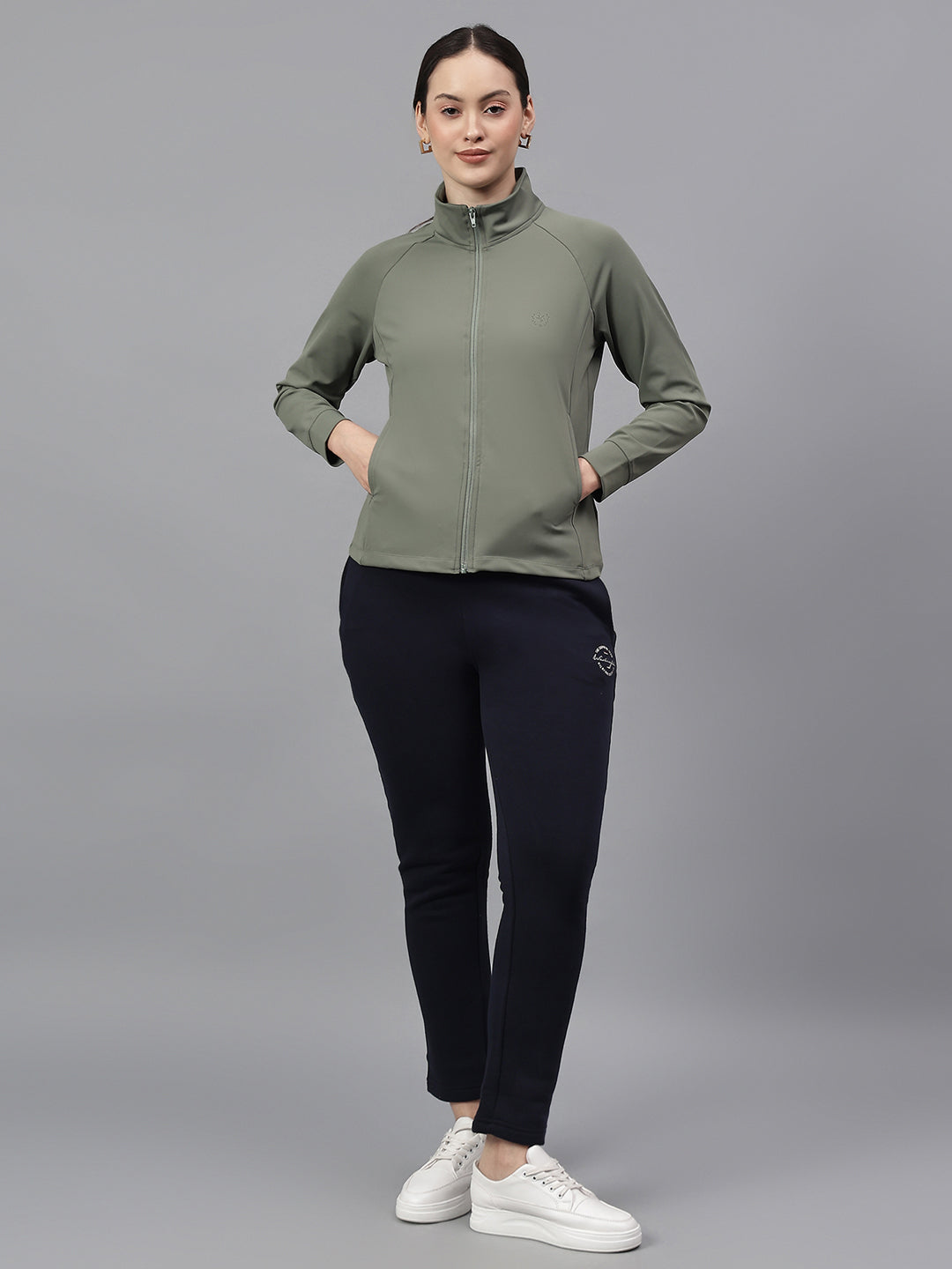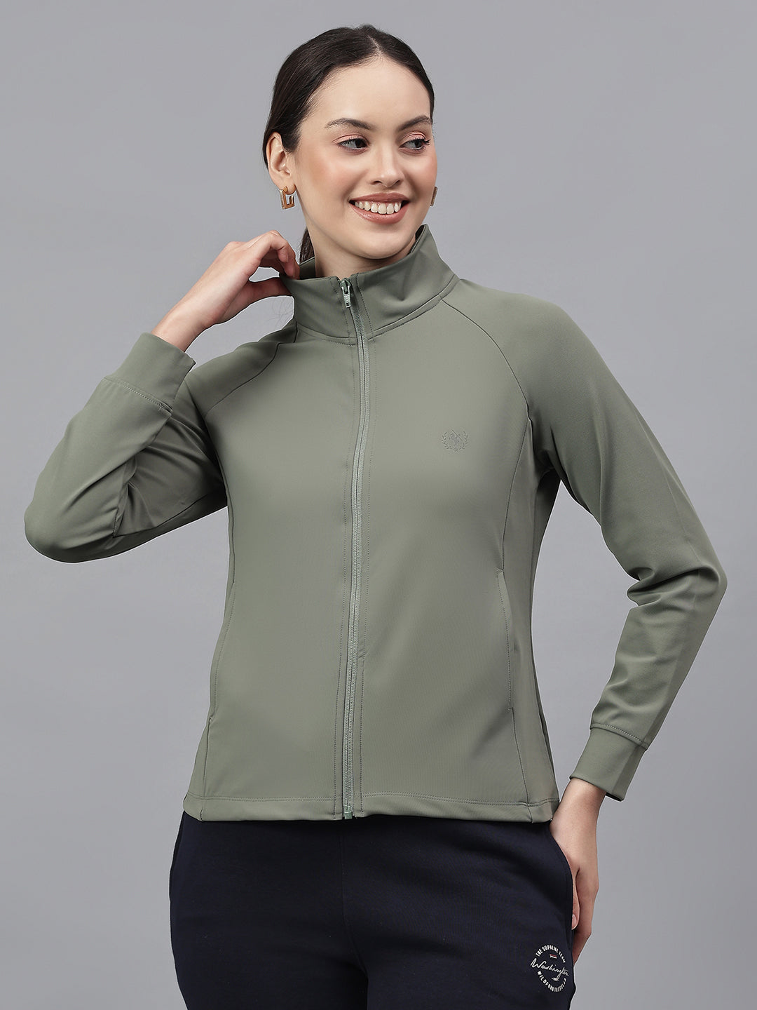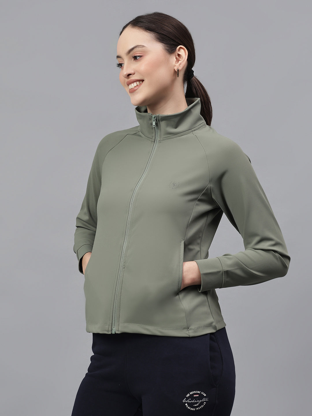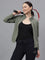 Women's Solid Green High Neck Full Sleeves Casual Jacket