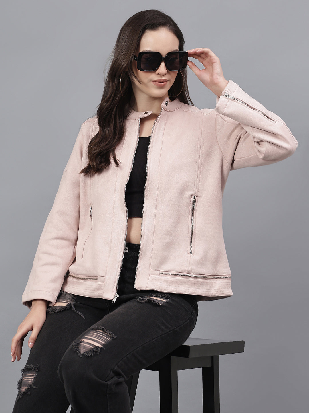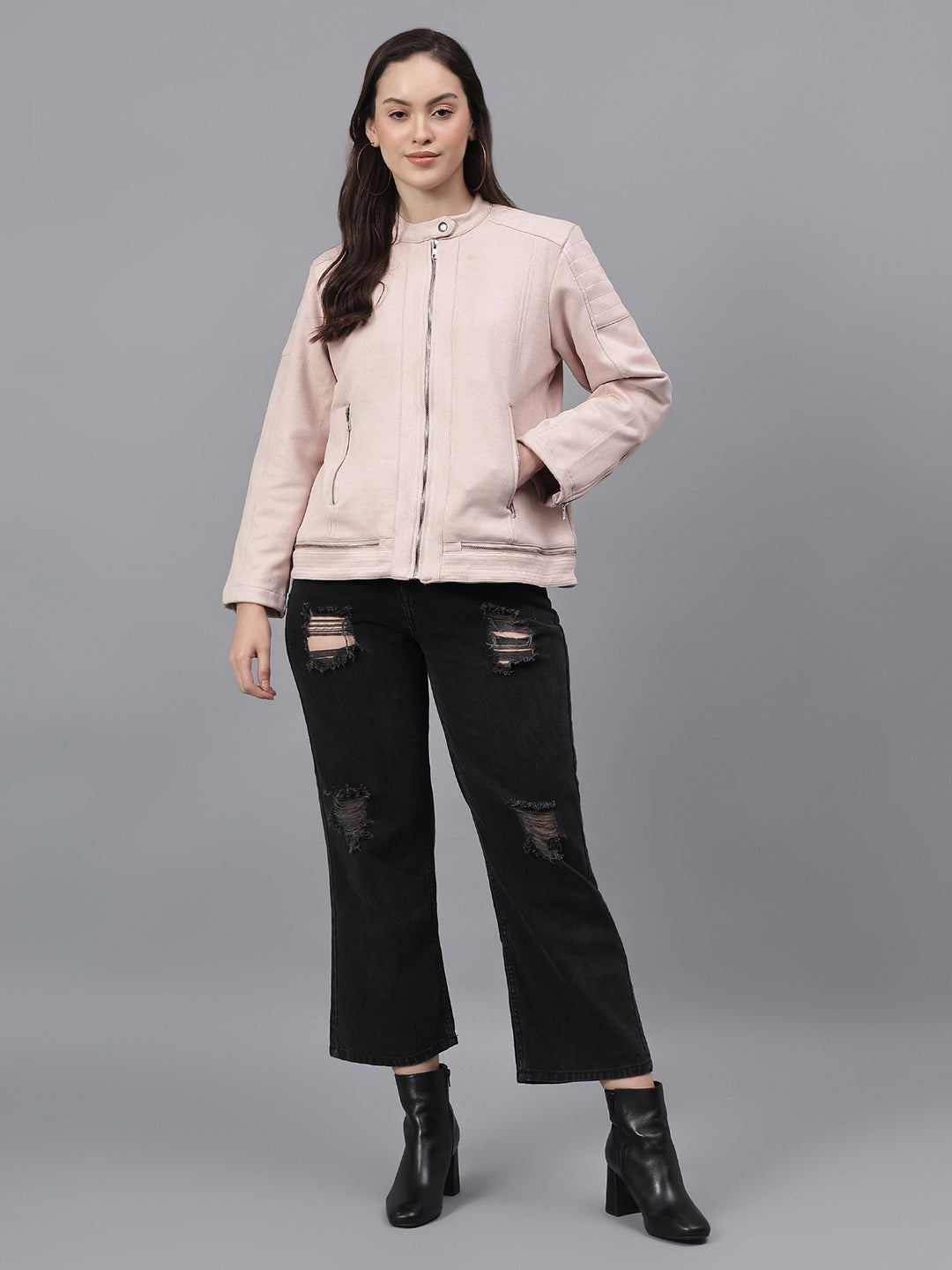 Women's Solid Pink Mock Neck Full Sleeves Casual Jacket