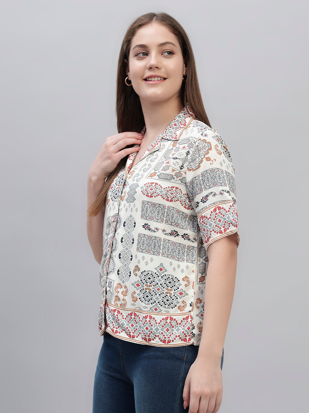 Women's White Printed Half Sleeves Spread Collar Casual Top